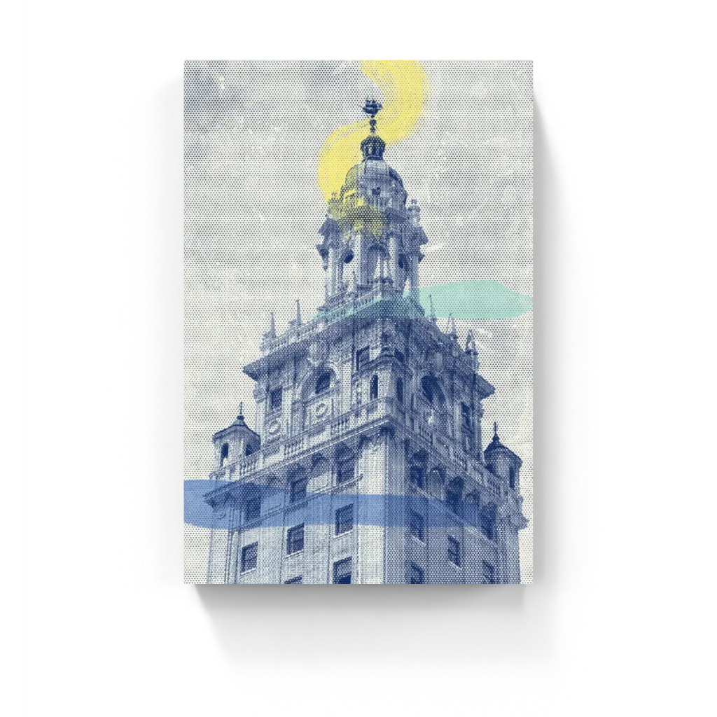 Stylish pop-art illustration of Miami's historic Freedom Tower, depicted in captivating blue halftone dots and accented with vibrant yellow brushstrokes, blending architectural heritage with contemporary graphic artistry.