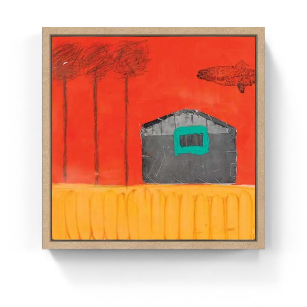 A bold red sky looms over a stylized house, floating fish, and linear trees in this playful abstract. With rich textures and surreal simplicity, it evokes a dreamlike rural scene.