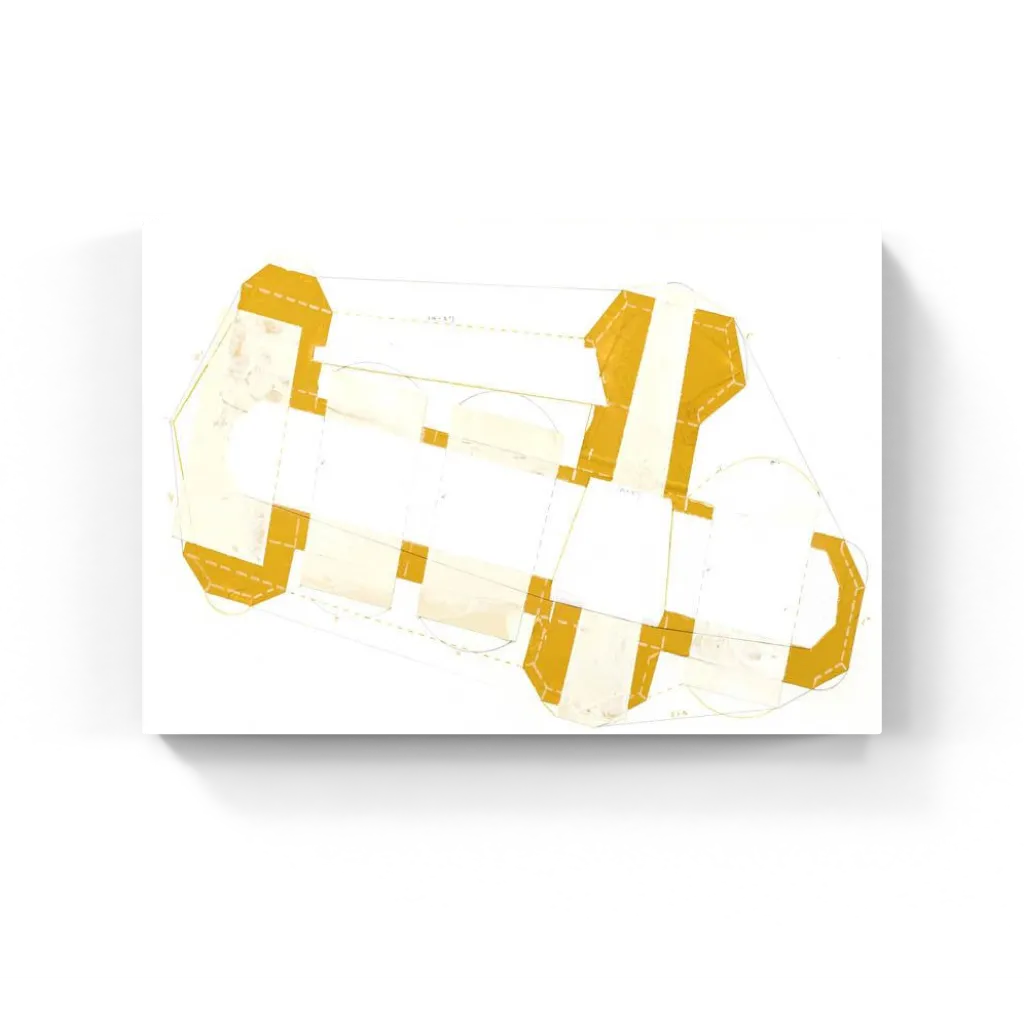 “Schematic I” blends precision with abstraction—layered geometric shapes in burgundy, cream, and translucent white intersect with fine red construction lines, suggesting architecture or conceptual design.