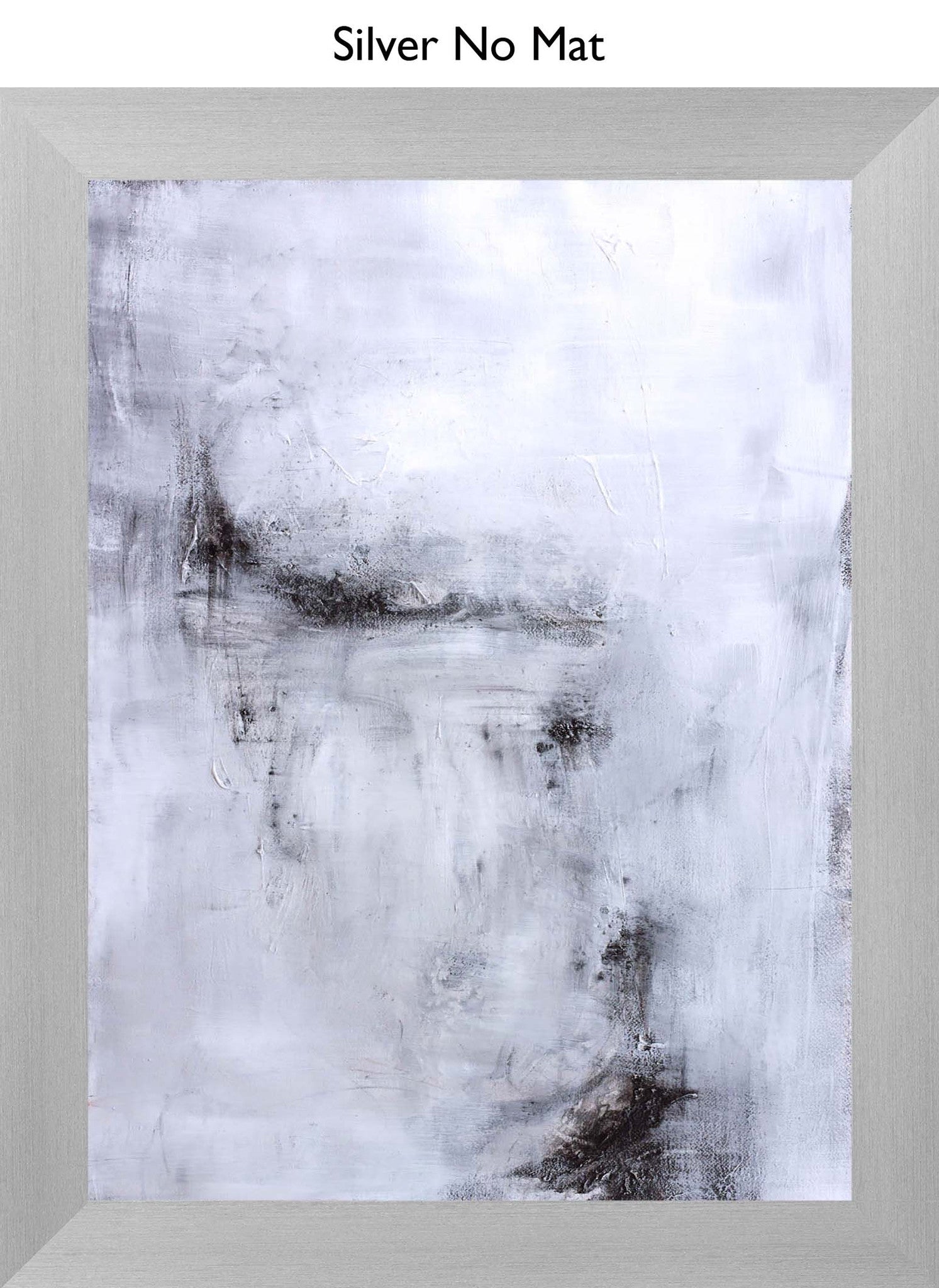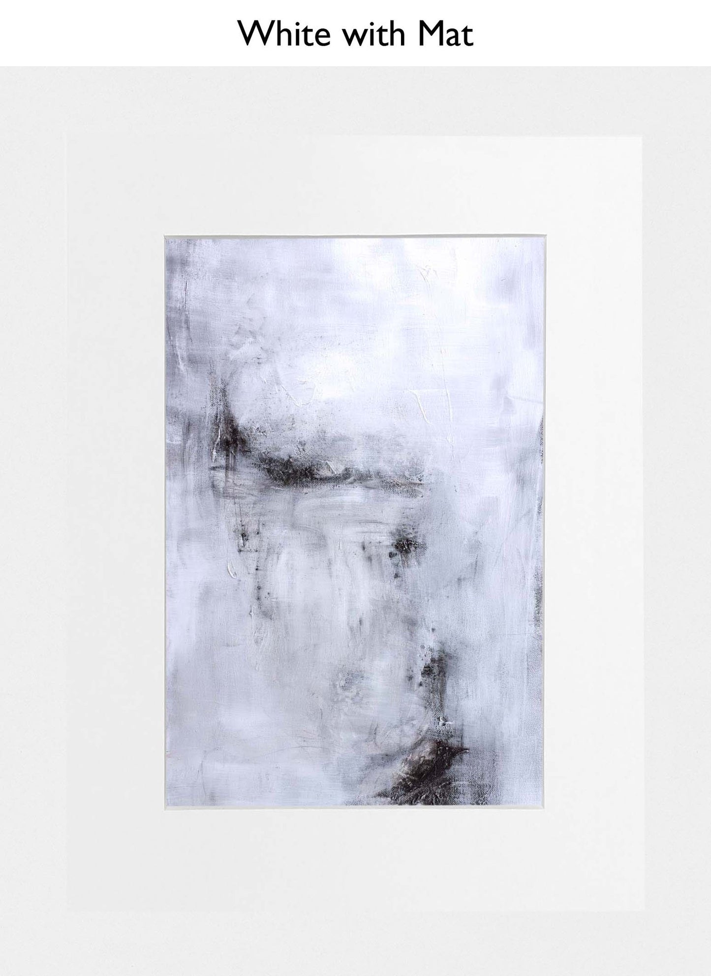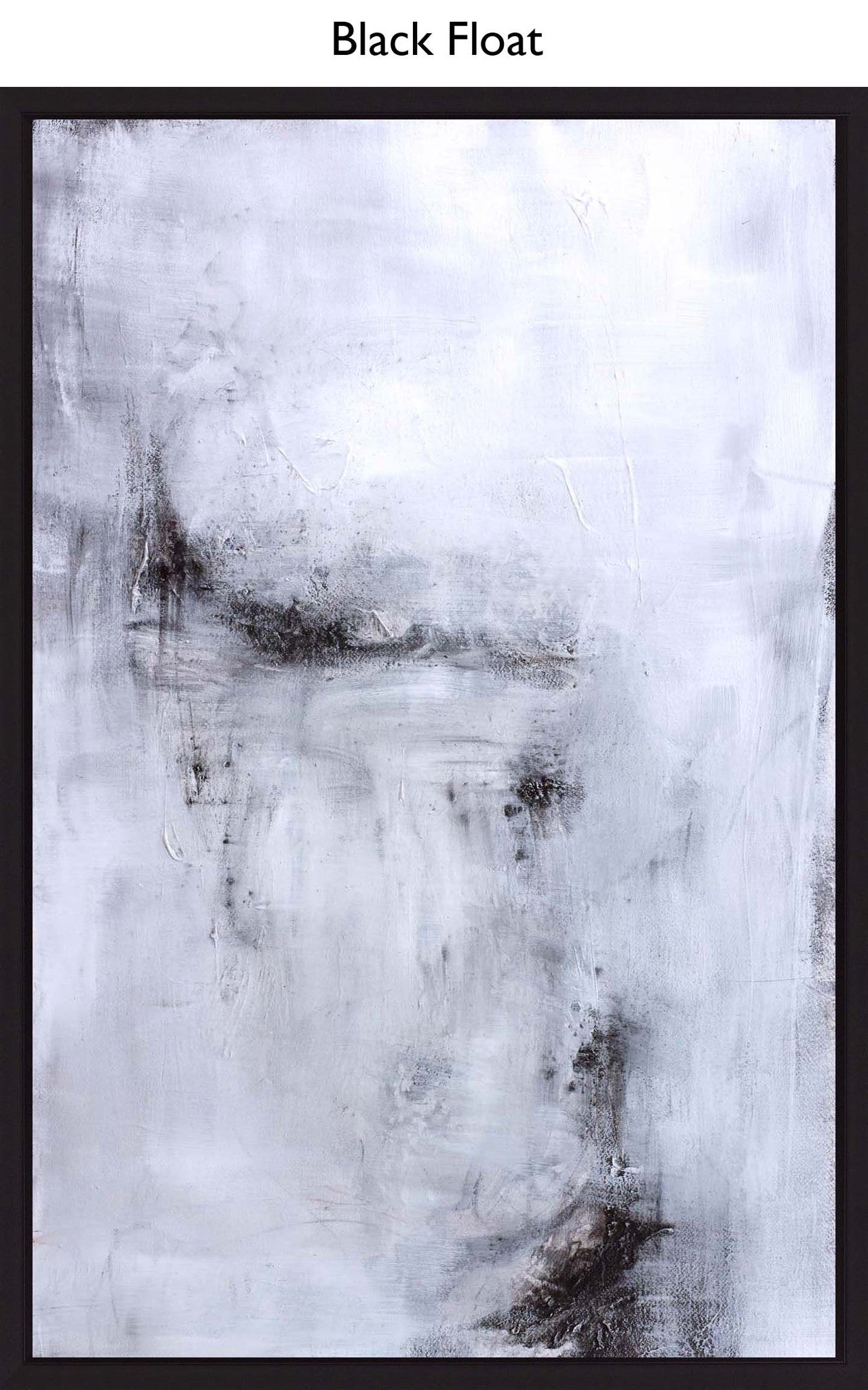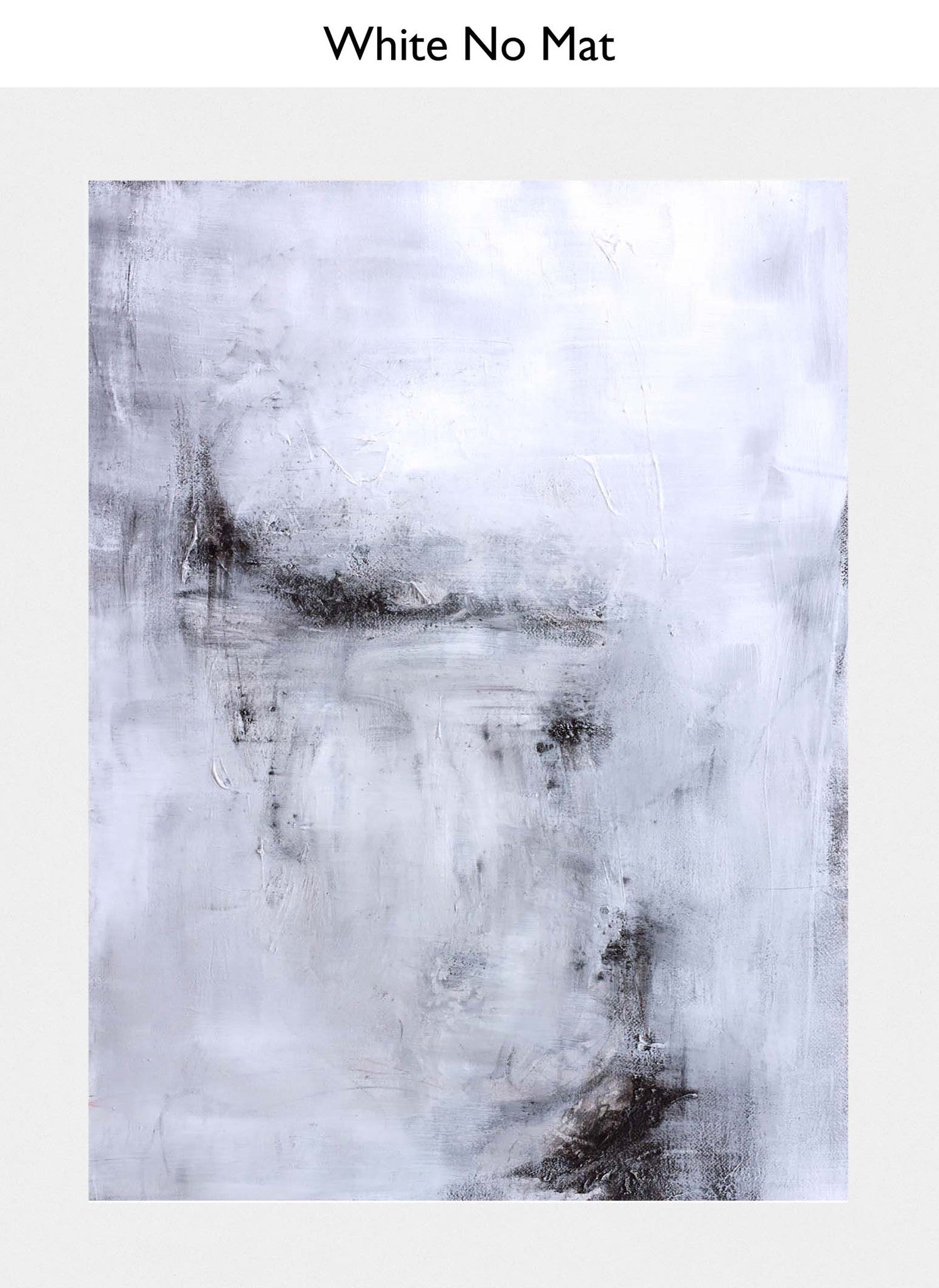 Abstract monochrome painting featuring blurred strokes of white, gray, and black evoking a moody, mist-covered landscape. Ideal as modern and minimalist wall art.