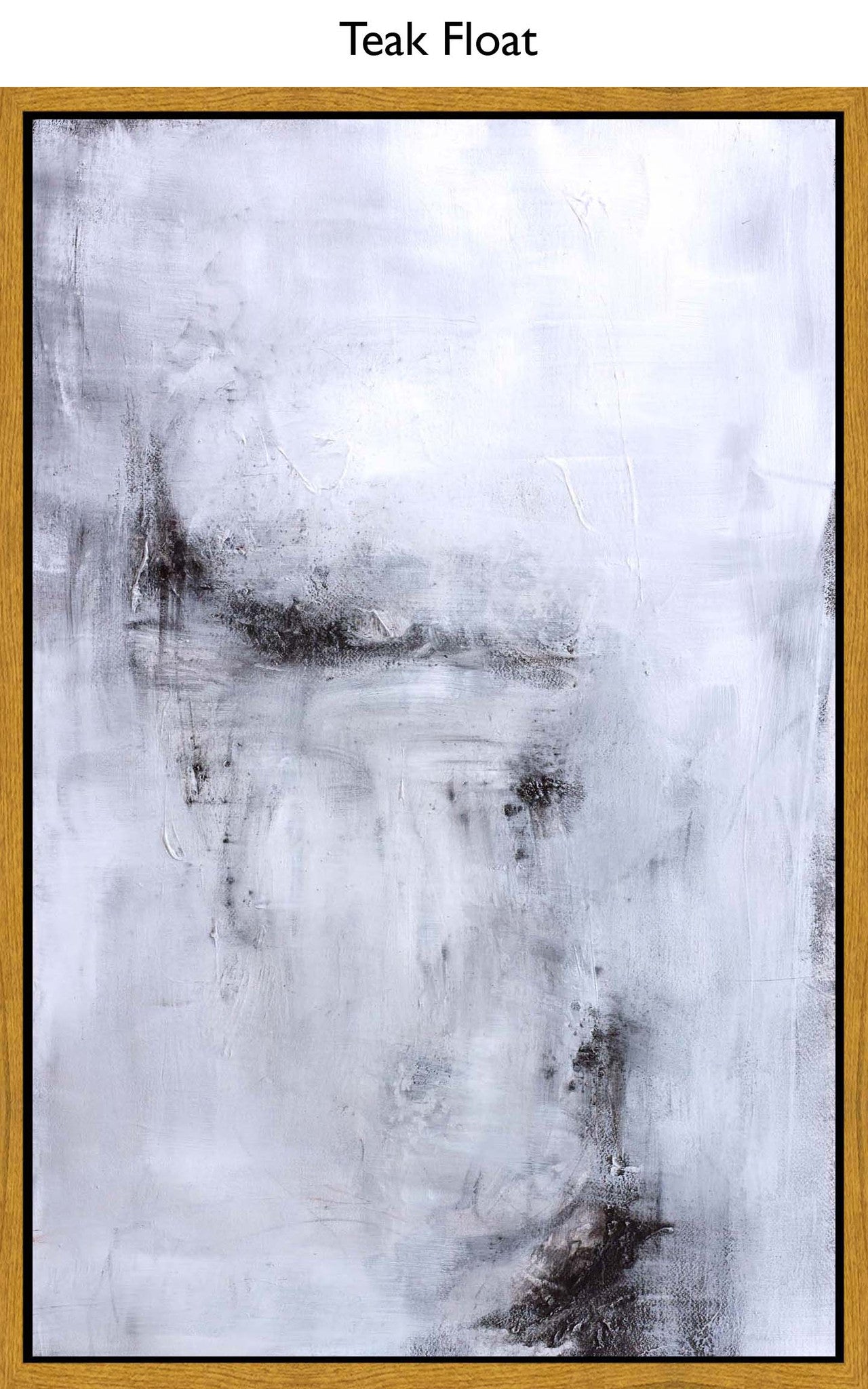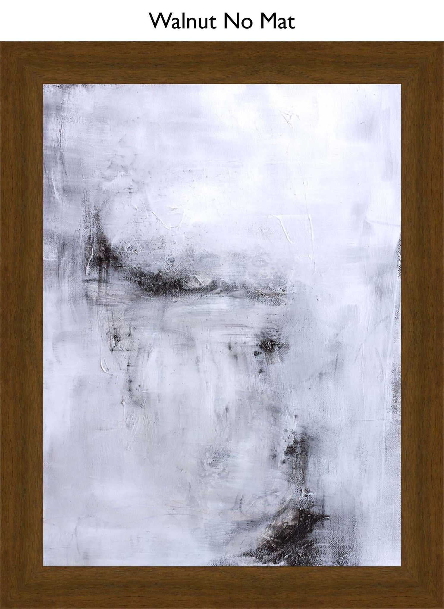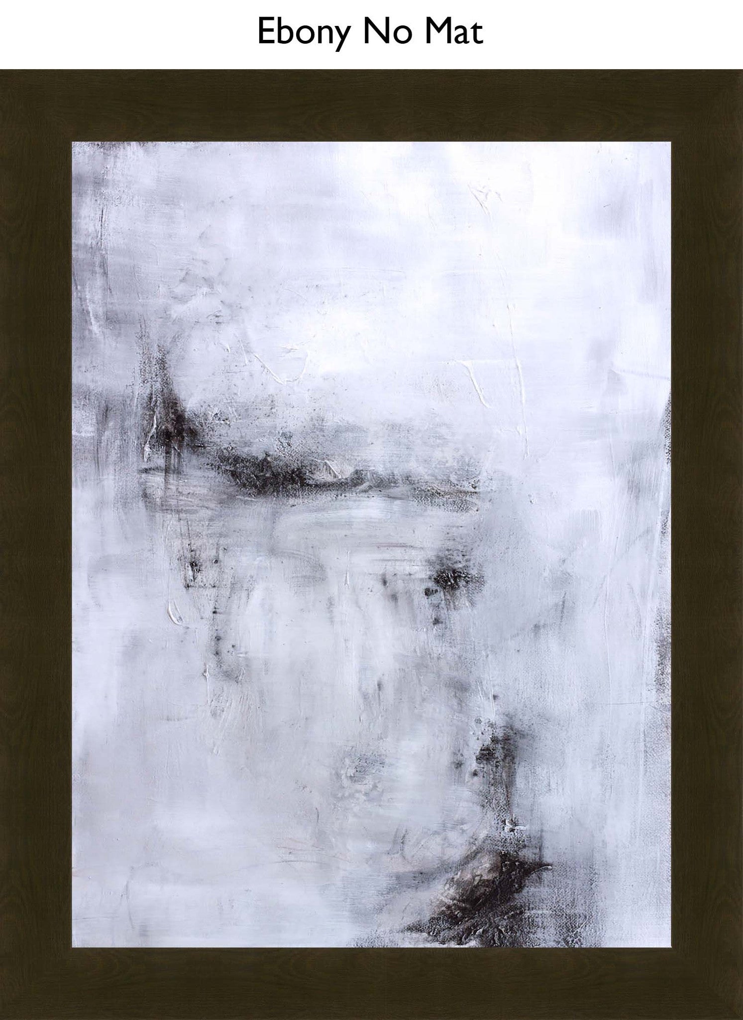 Abstract monochrome painting featuring blurred strokes of white, gray, and black evoking a moody, mist-covered landscape. Ideal as modern and minimalist wall art.