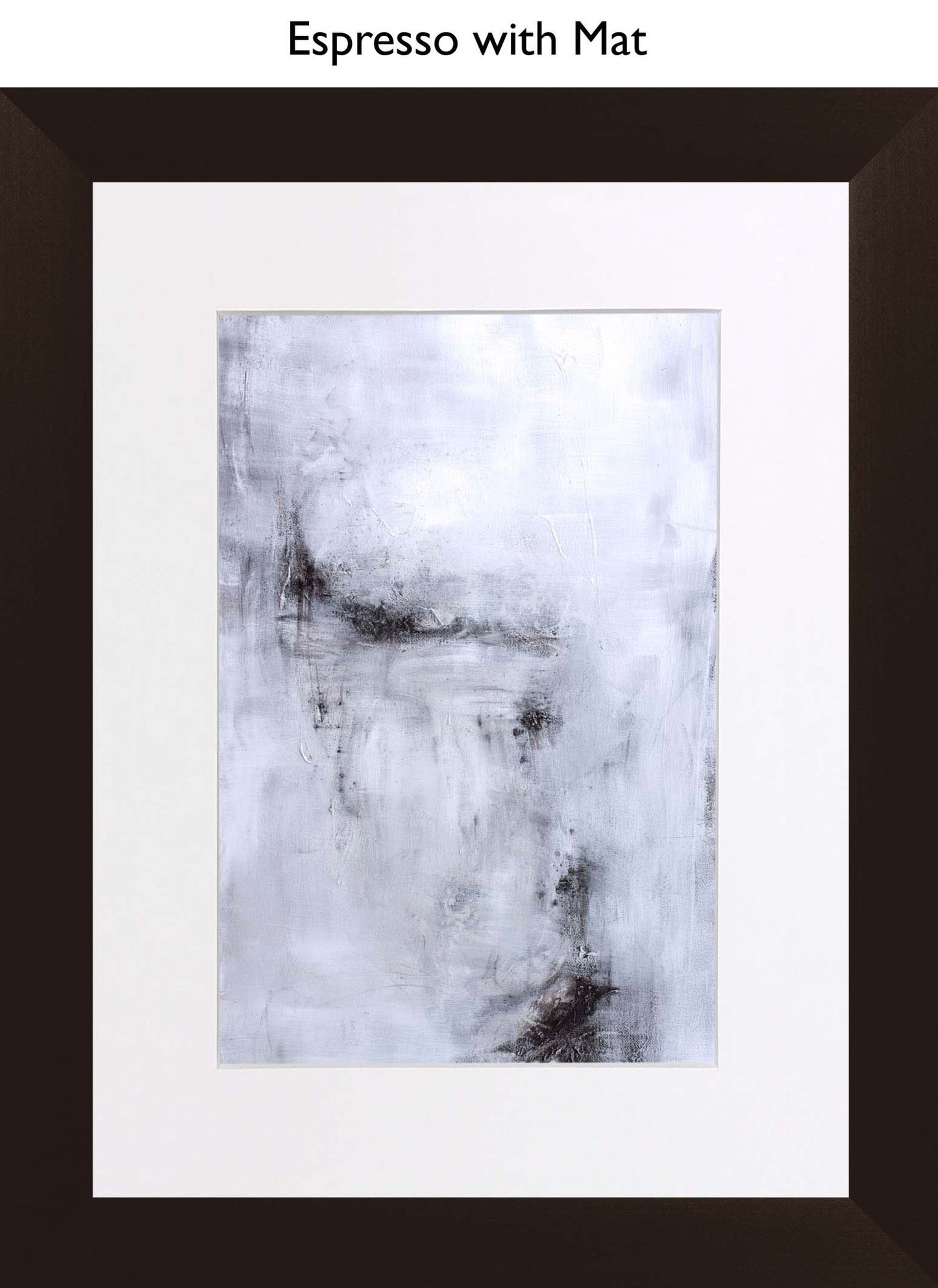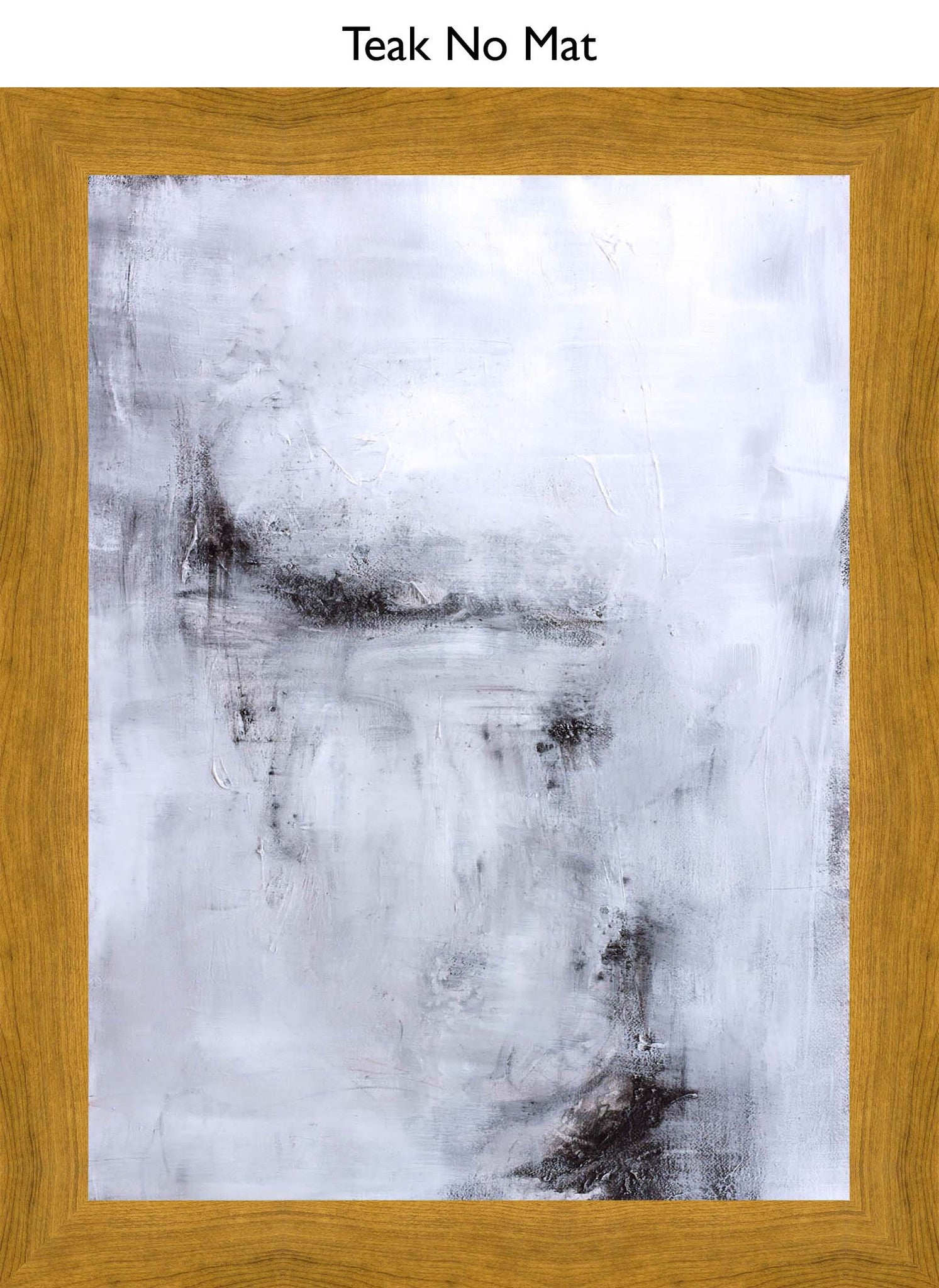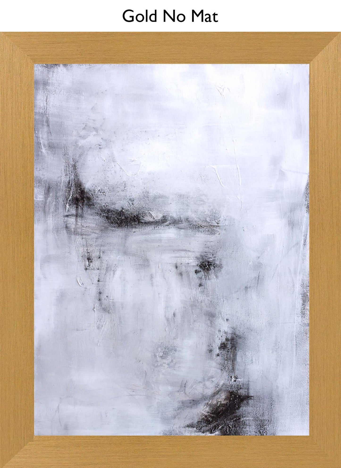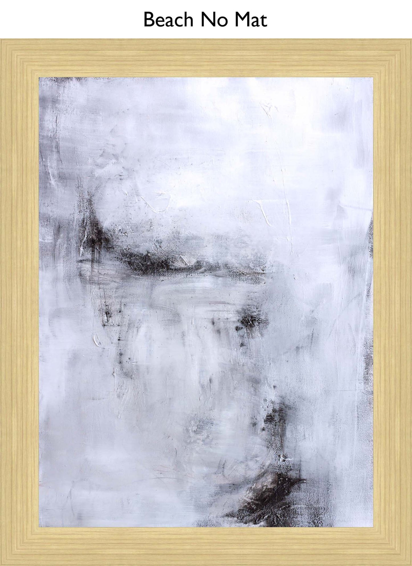 Abstract monochrome painting featuring blurred strokes of white, gray, and black evoking a moody, mist-covered landscape. Ideal as modern and minimalist wall art.