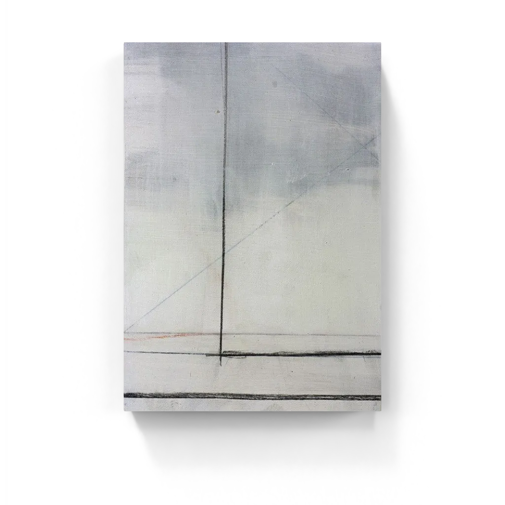 Minimalist abstract painting characterized by gentle geometric shapes and intersecting lines in subdued gray tones, conveying a sense of refined simplicity and modern calm.
