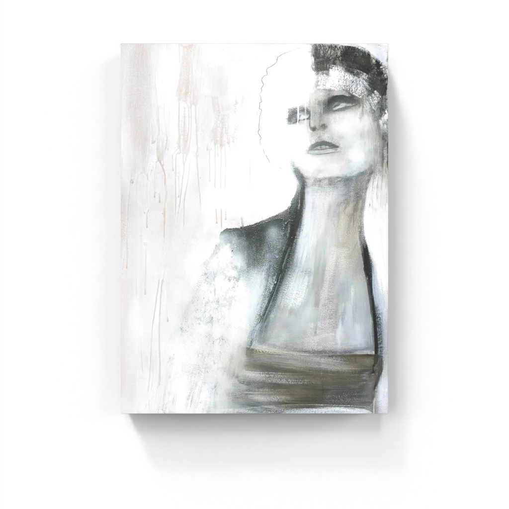 A ghostly portrait emerges in smudges and drips—half-formed, half-vanished. Her eyes are distant, her presence fractured. A mind alight and dissolving in silence.