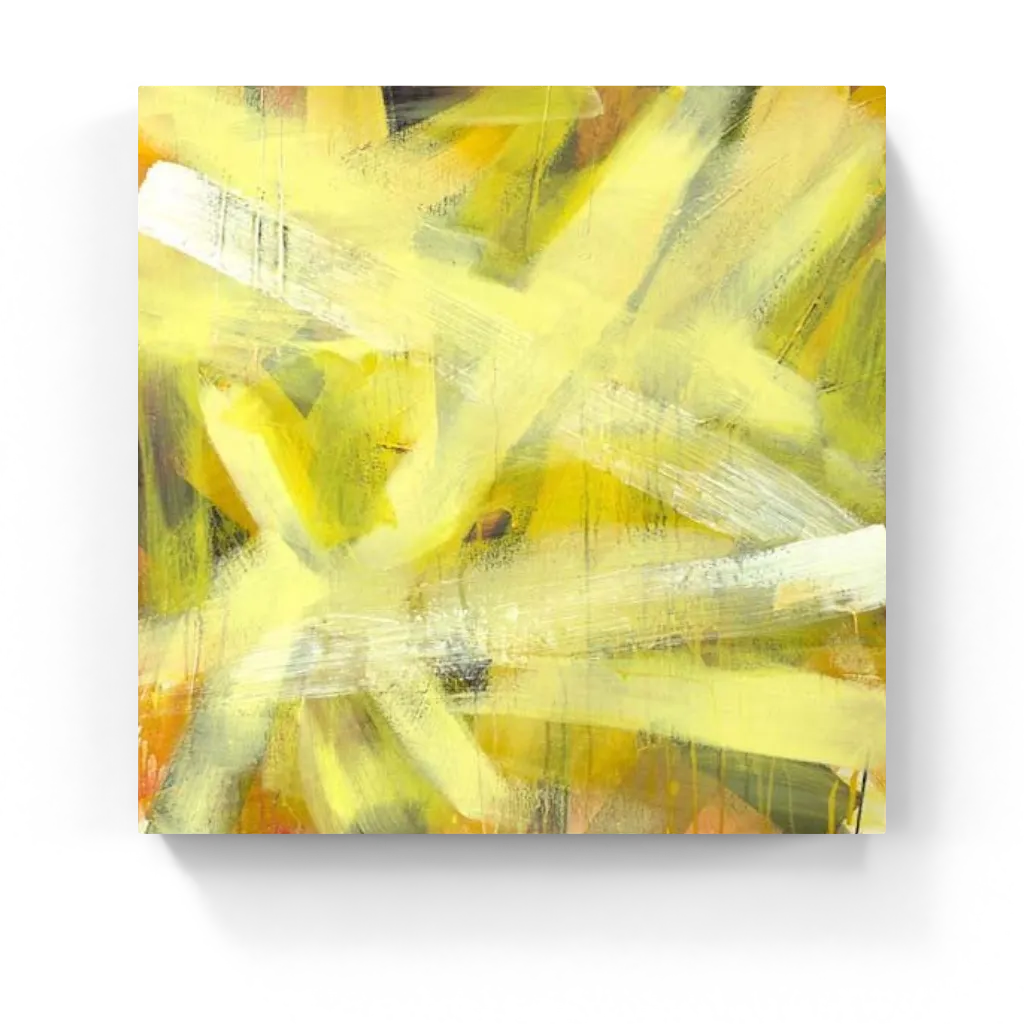 Abstract painting bursting with energetic brushstrokes in radiant yellows, soft gold, and subtle hints of gray. Layers of dynamic textures create a vibrant interplay of color and spontaneous movement, evoking warmth and bold creativity.