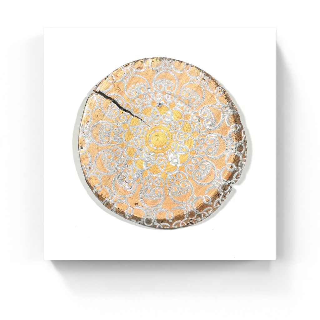 A golden mandala glows from the heart of a raw wood slice, its delicate silver filigree wrapping around age-worn cracks and rings. “Timberland I” fuses earth and spirit—nature’s geometry gilded with sacred design.
