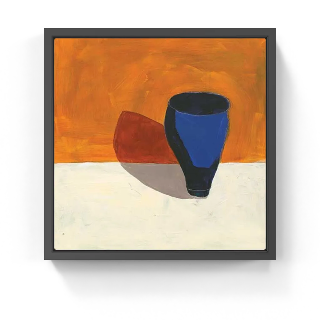 A fiery red vessel stands stark against a pale ground and golden backdrop—its deep shadow stretches leftward, grounding this minimalist composition in quiet drama and striking contrast.