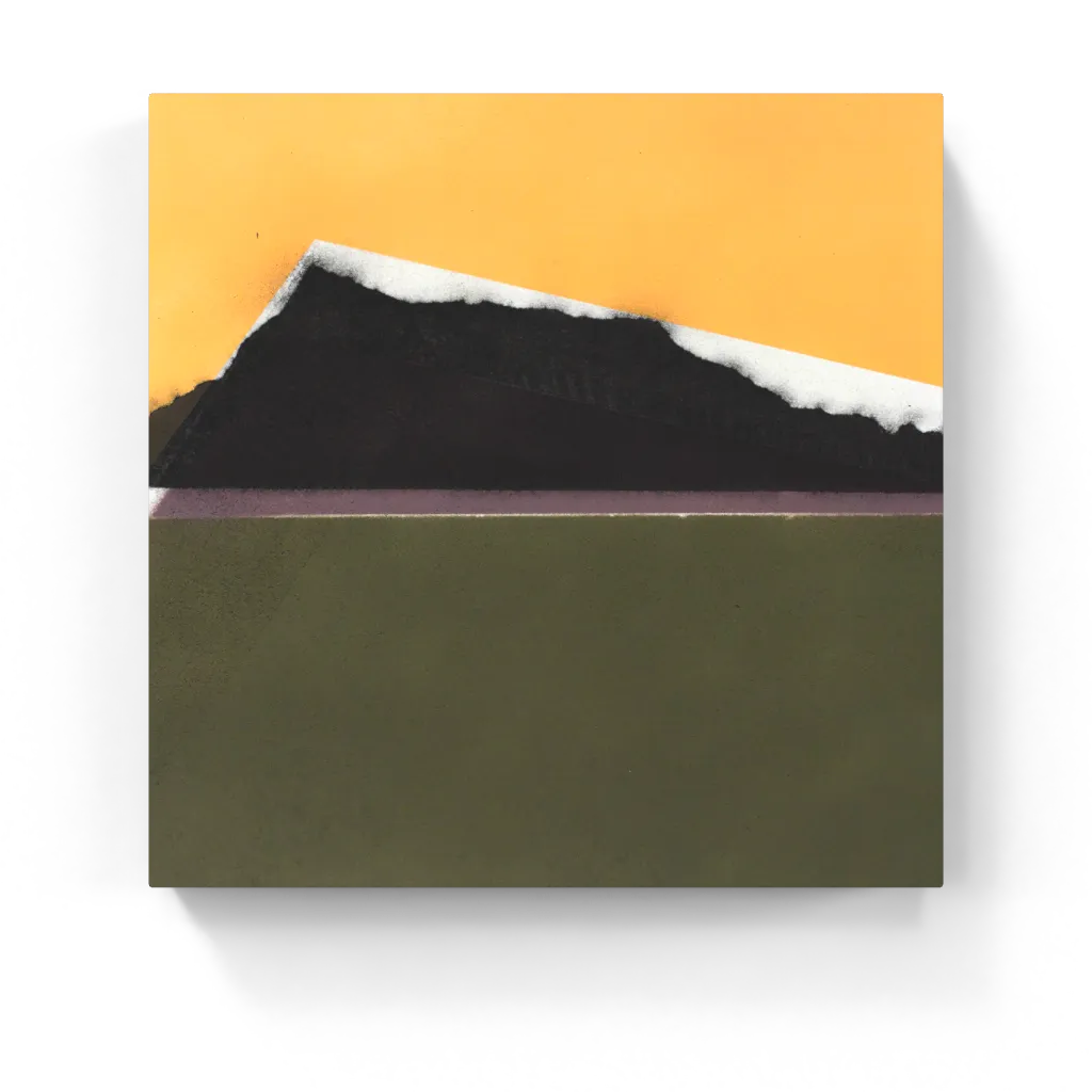A bold black ridge cuts diagonally across a golden sky and olive plain, edged with a jagged frost of white. This geometric abstract evokes desert stillness, cinematic scale, and frontier mystery.